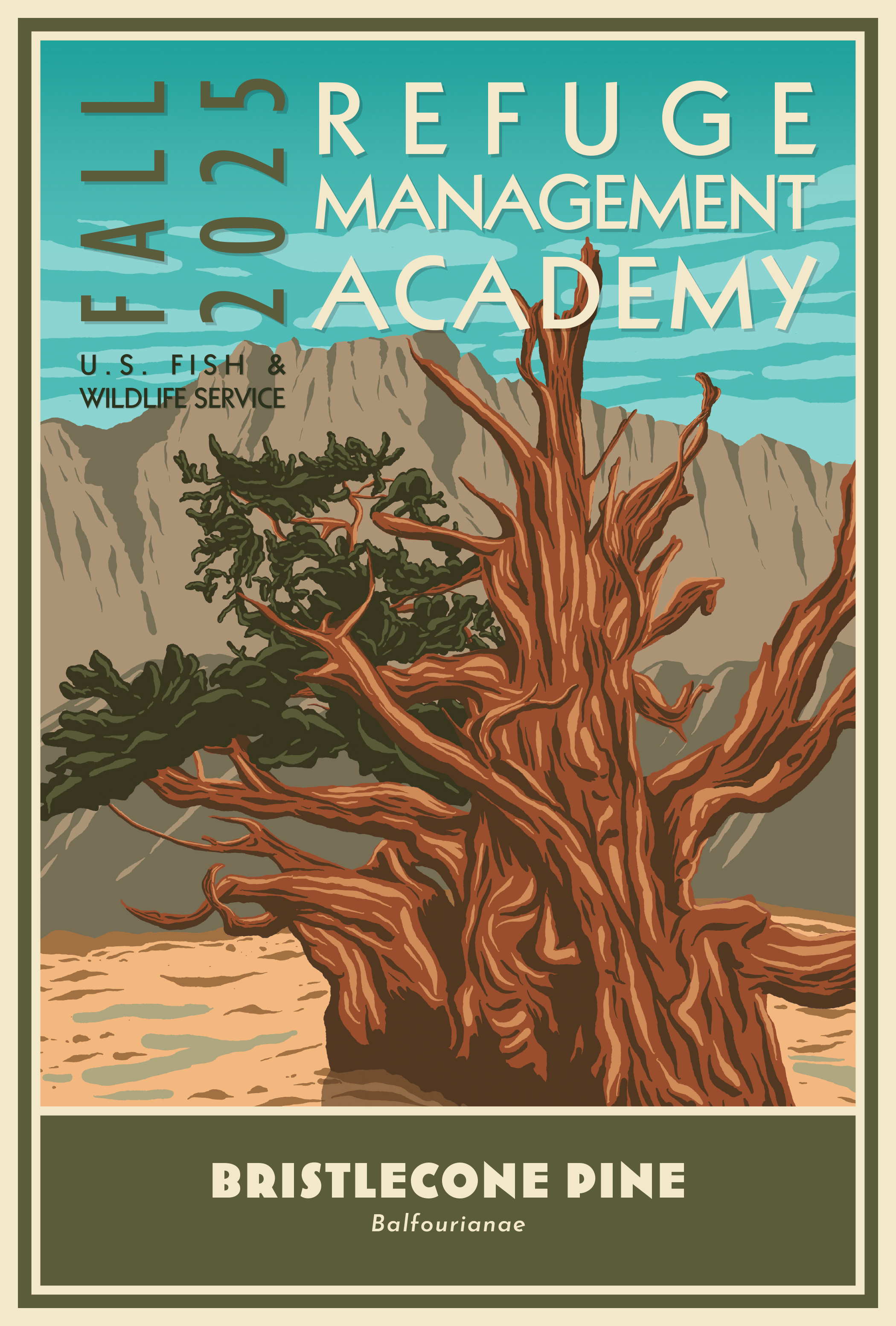 Poster and Course Handbook Design for the National Conservation Training Center’s Refuge Management Academy for Fall 2025. Each year, a species is chosen to be depicted on the posters. This year’s was the Bristlecone Pine tree. These posters were designed to emulate old WPA graphic posters. Created in Procreate and Photoshop. Text layout in InDesign.